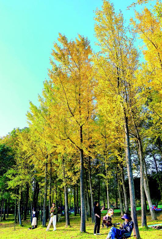 11月4日,六安城区秋高气爽,天朗气清,赤壁路桥西侧滨河大道附近的一片银杏树林迎来了最佳观赏期。大片银杏叶与苍翠的绿植相互映衬,构成了一幅层次丰富、色彩浓郁的生态画卷,吸引众多市民前来休闲打卡,尽享美好时光。